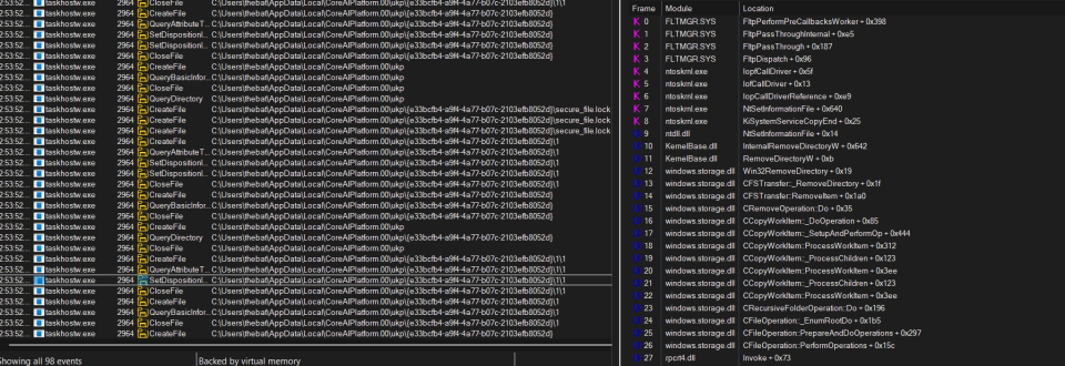 Once the secure_file.lock file is created a function will return and it will continue to clean up the directory using the old TryDeleteUniqueDirectory function. This is where an issue arises with the patch, while they managed to protect the “unique” directory, any sub-directory is unprotected. The IFileOperation::DeleteItem used by TryDeleteUniqueDirectory will perform recursive deletion by default, this allows us to bypass the patch by just creating additional sub-directories inside the %USERPROFILE%\AppData\Local\CoreAIPlatform.00\UKP\<GUID> directory.