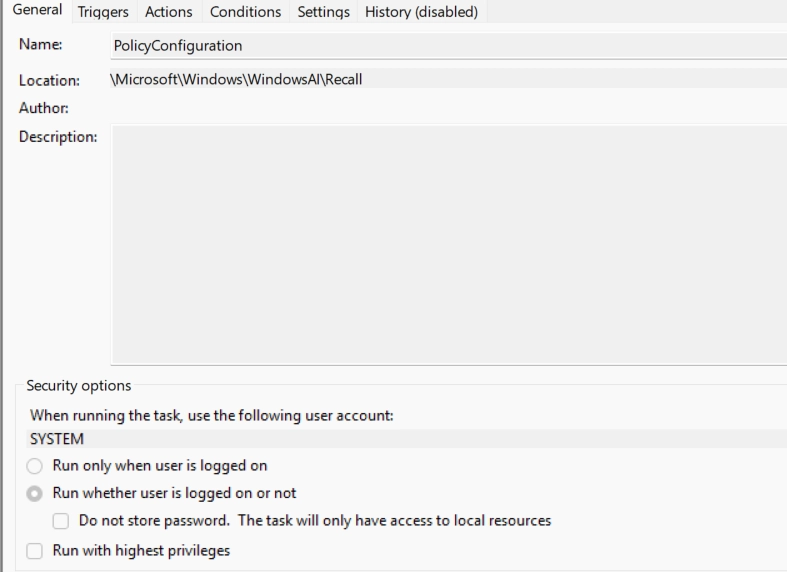 <URI>\Microsoft\Windows\WindowsAI\Recall\PolicyConfiguration</URI>