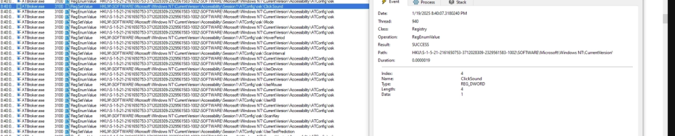 The ATbroker.exe process running as the SYSTEM account will proceed to copy values from HKLM\SOFTWARE\Microsoft\Windows NT\CurrentVersion\Accessibility\Session1\ATConfig\osk